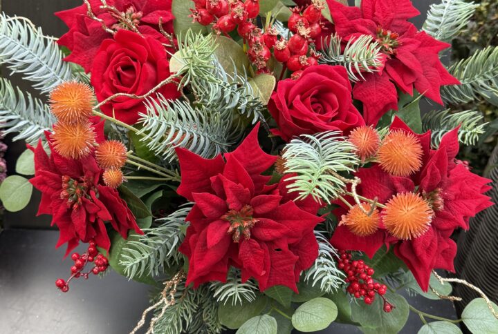 Piękny bukiet z gwiazd betlejemskich, wyglądający jak żywy. Idealny na nadchodzące święta, wprowadza świąteczny nastrój i dekoracyjny akcent do każdego wnętrza.