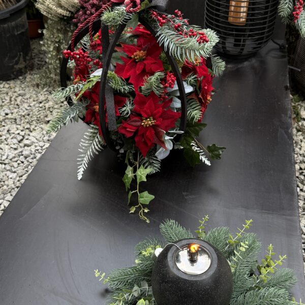 Piękny, wylewający się bukiet z storczykiem w odcieniach różu i borda, wykonany ze sztucznych kwiatów w standardowym flakonie florystycznym. Starannie ułożony, trwały i elegancki – idealny na grób, by przez długi czas cieszył oko i podkreślał pamięć o bliskich.