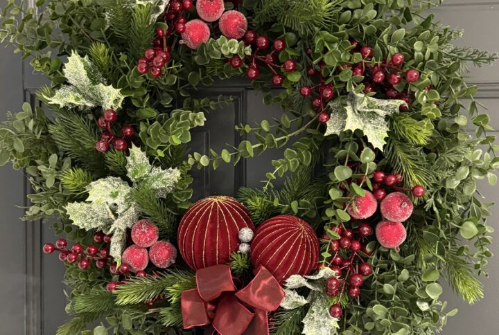 Świąteczna kompozycja na pomnik wykonana w drewnianej podstawie o wymiarach ok. 77 × 37 cm. Kompozycja łączy sztuczny świerk, gwiazdy betlejemskie, bombki i starannie dobrane dodatki, tworząc elegancki i trwały akcent świąteczny.