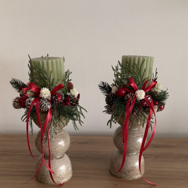 W komplecie znajdują się grube, złote świece, które idealnie komponują się z głęboką zielenią świeczników, tworząc efektowną i elegancką dekorację. Całość pięknie prezentuje się na stole, komodzie, konsoli czy kominku, wprowadzając do wnętrza ciepły, nastrojowy klimat.
